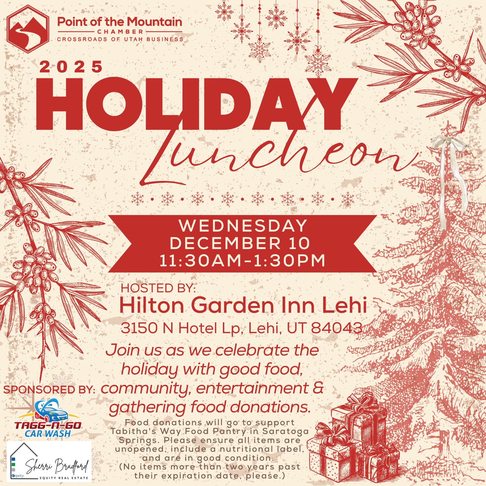 Food donations will go to support Tabitha's Way Food Pantry in Saratoga Springs. Please ensure all items are unopened, include a nutritional label, and are in good condition.